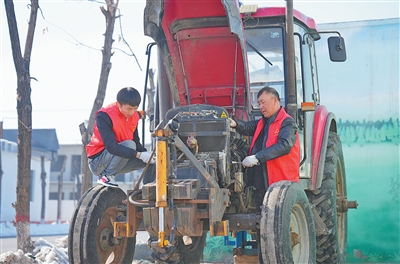 新疆沙湾市金沟河镇党员致富带头人、农技人员在宋圣宫村帮助农户检修农机。
