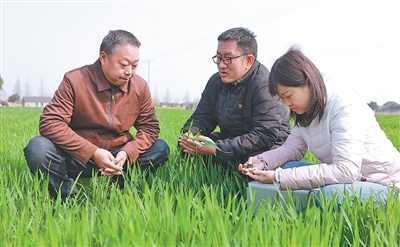 江苏句容市白兔镇倪塘村,党员服务队的技术人员采集土壤样本,指导农户春耕生产。