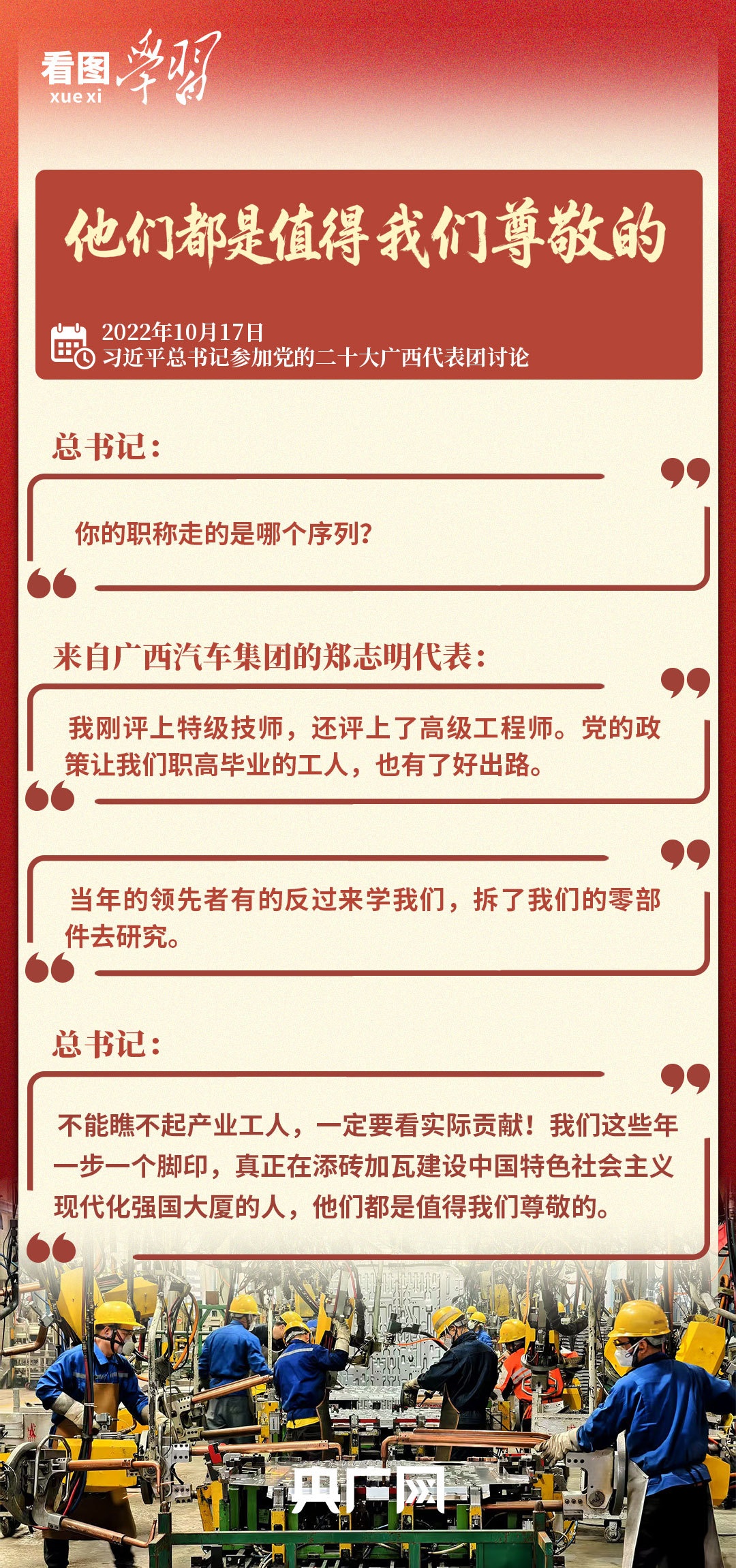 “真正在添砖加瓦建设中国特色社会主义现代化强国大厦的人,他们都是值得我们尊敬的”。今天,让我们一同重温总书记的亲切话语,感受总书记对一线劳动者的尊重与关爱,向每一位劳动者致敬!
